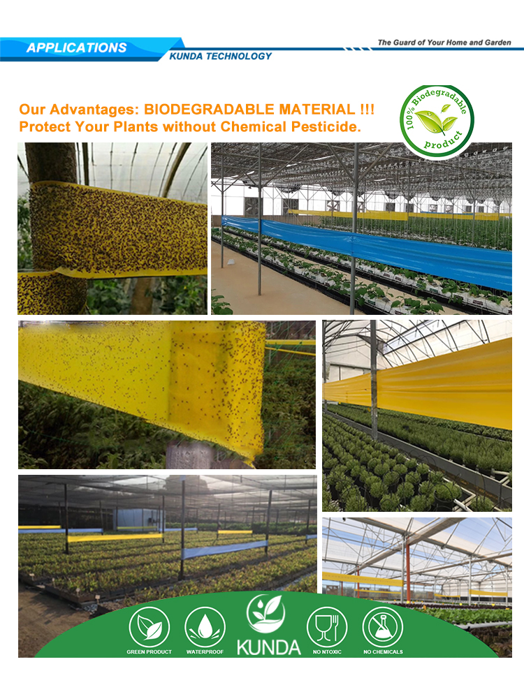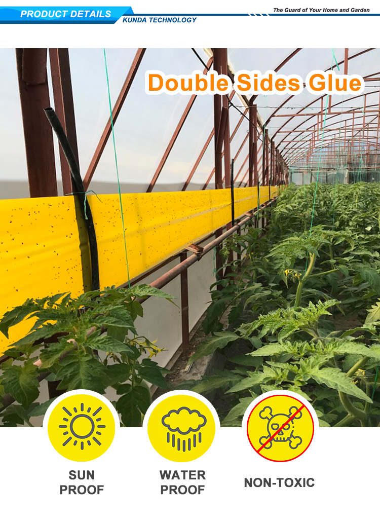 2.Kunda Yellow Glue Roll can be hung horizontally above the crop, around the side of the greenhouse or between rows.